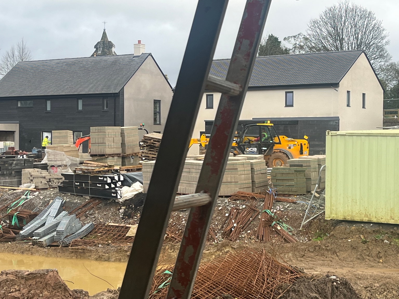 On 21 March we are going to hold another open house with potential buyers able to view 3 completed plots/3 different house types - the Beech, Cedar and Willow. Plot 20 (our current show home, but now sold), Plot 18 (our new show home on completion of the sale of Plot 20), and Plot 19 will all be available for viewings. For those seriously interested we may even be persuaded to allow a walk down the road to the bottom of the site. Although there is a lot of mess in the foreground, you can see how nicely Plots 18 and 19 are coming along.